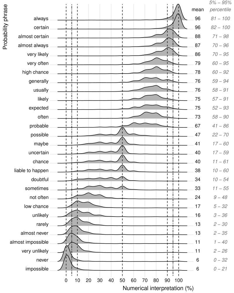 There is a chart from Willems, Albers, and Smeets (2020), and it maps probability phrases to their numerical interpretations across hundreds of respondents. "Likely" has a mean of 75%. Sounds clear enough. Except the 5th-to-95th percentile range runs from 57% to 91%. "Probable" sits at 67%, ranging from 41% to 86%. "Possible" hits 47%, ranging from 22% to 70%.